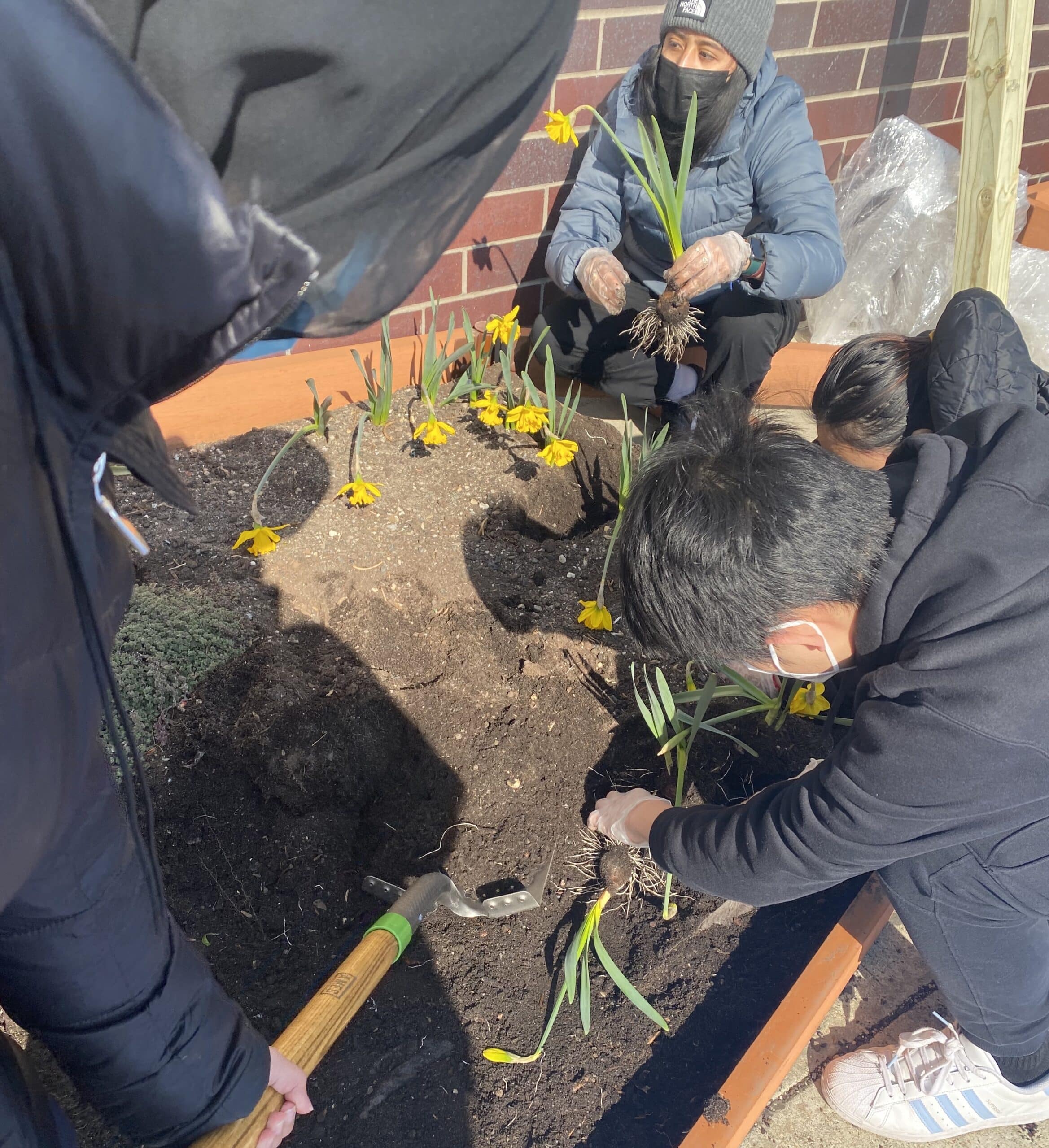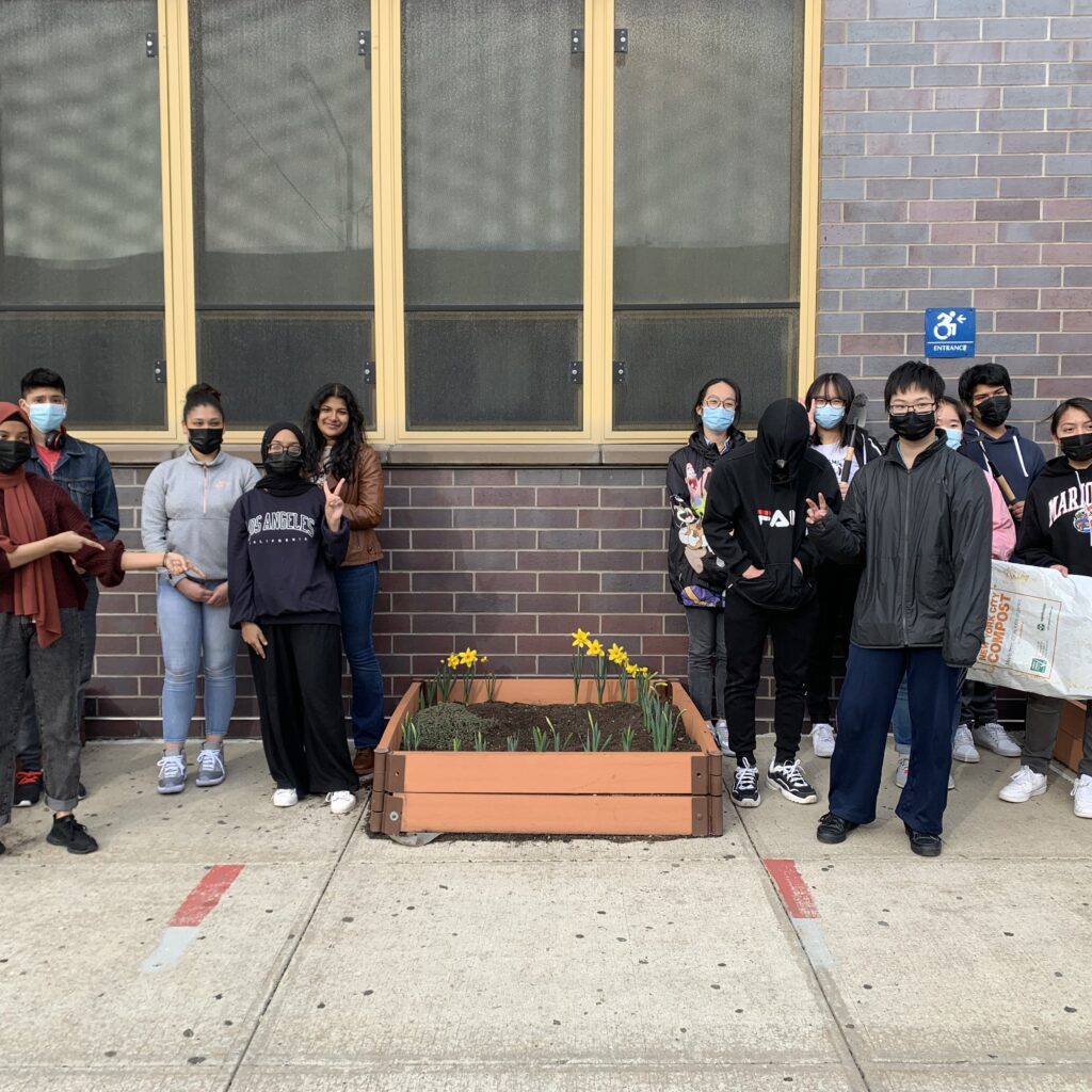 The other team worked in collaboration with Sunset Park High School’s Green Team to repair the outdoor raised garden beds and plant spring bulbs and seedlings. They also put together a guide, with helpful gardening tips and information about some of the flowers they planted.
